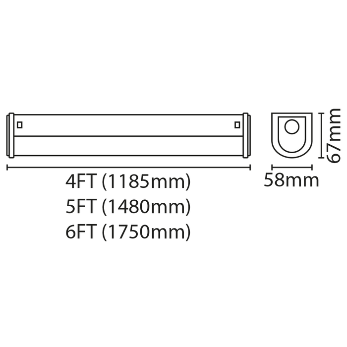 5ft LED highly efficient economy batten fixture, slim profile design with even light distribution, front diffuser and end caps removable to allow for easy wiring at either end of the batten or Besa mounting from the rear of the fitting, available in both standard and high output mode to suit different ceiling heights and task requirements